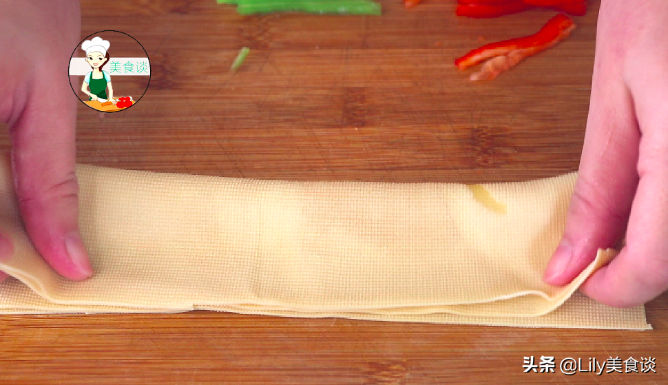 5、再准备一点事先准备好的青红椒丝放在切好的豆腐皮中间做花蕊,然后从豆腐皮的一端卷起来。