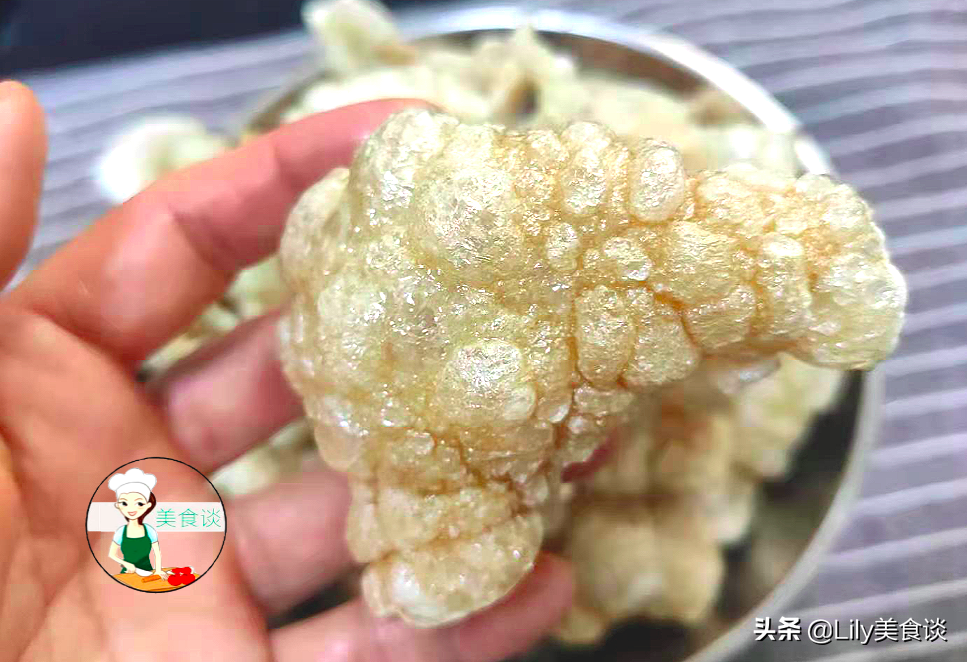 猪皮做的美食还真不少,除了凉拌猪皮、卤猪皮,还有非常开胃好吃的猪皮冻之外,我们家过年更喜欢吃:炸猪皮泡,而且每年过年前都会提前做上10斤8斤的囤起来过年的时候吃,拿来泡软后切片和蒜苗爆炒、凉拌或者是冬天涮火锅吃,简直不要太赞了,关键是炸好的猪皮泡还特别耐放,一次多做一些,放冰箱里保存起来,随吃随取,特别方便又省事,过年拿来刷火锅烫一烫就能吃了,味道好又方便,好吃也不油腻,关键是还比肉菜便宜。
