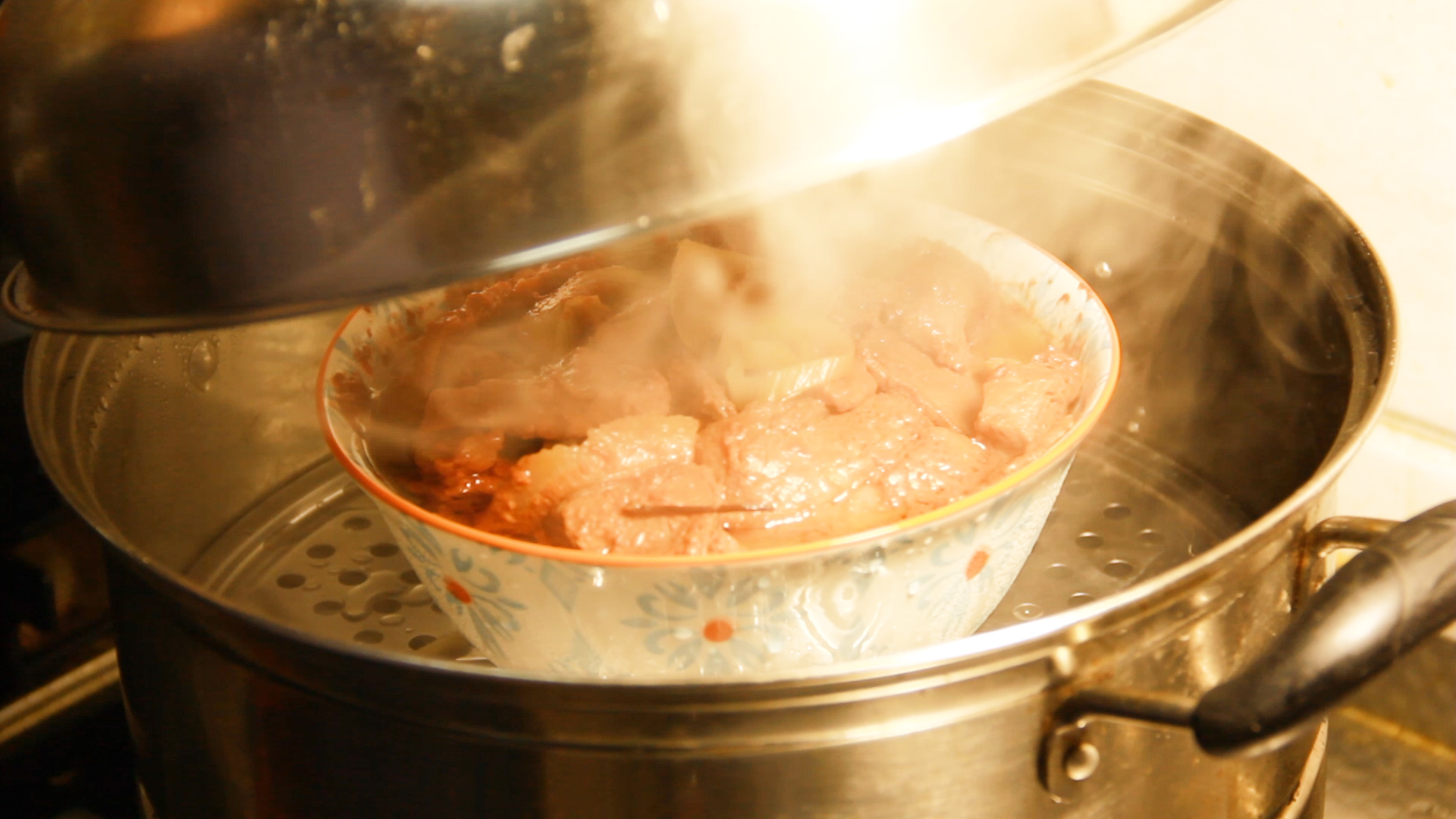 然后就可以放入蒸锅,盖上盖,蒸一个半钟头,