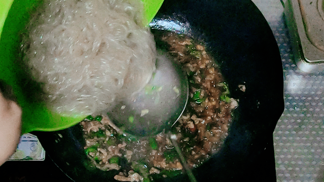 等到香气四溢满厨房都是后,放入沥干水的粉条,