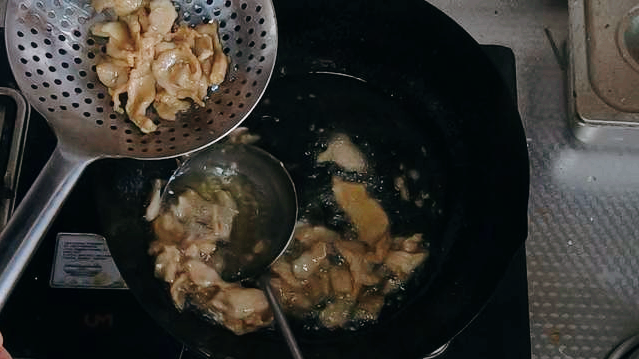 “起锅烧油”既是动作也是冲锋的号角,不过这次油需要稍微多些,三成油温,把腌好的肉片放入,