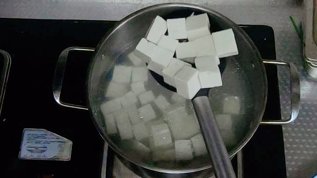 豆腐焯水的时间不用太久,水滚开后20来秒就OK。