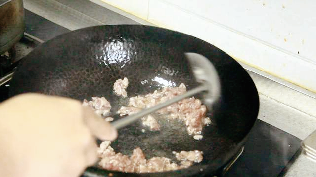 右手可不能搁一旁傻傻地只顾着看,得赶紧上去用勺快速炒散,炒出肉香,如果想达到牛肉的效果,就开大火炒狠一些,要有焦粒感。