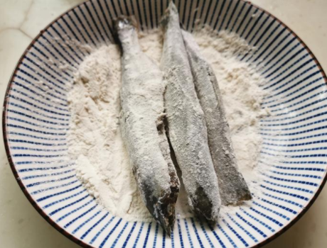 第四步,小鱼控下水,保持表面湿润,不要有太多的水分,将小鱼放入混合的粉中,均匀裹一圈,保证每个小鱼可以均匀粘裹一层薄粉便可;