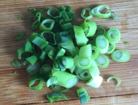 第三步,小葱或者是韭菜准备出少许,将其摘洗干净后,切成丁,放入在面糊中,搅拌好,静置15分钟,准备一个裱花袋,将拌好的面糊装入裱花袋中;