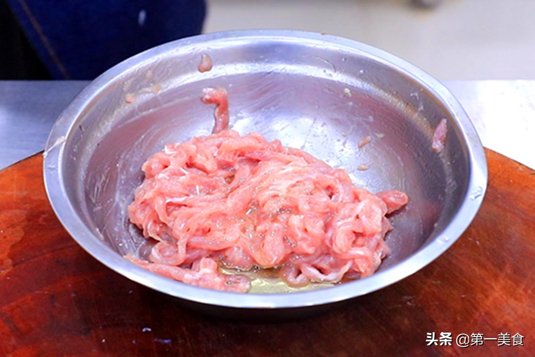 2.一块里脊肉切成细丝,放入盆中,加入一点食盐和料酒抓匀,肉丝吸收水分吃起来更加滑嫩;再放入一点淀粉锁住水分,淋入少许植物油防止粘连,抓匀后腌制10分钟。