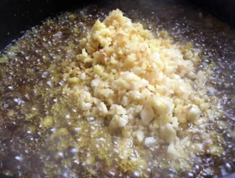 第四步,在炒锅中添上少许油,烧热后,放入蒜片和姜末,小火煸出香味,同时将干辣椒也放入在锅中,再次用小火煸香,关火,炒好的料倒入折耳根中;