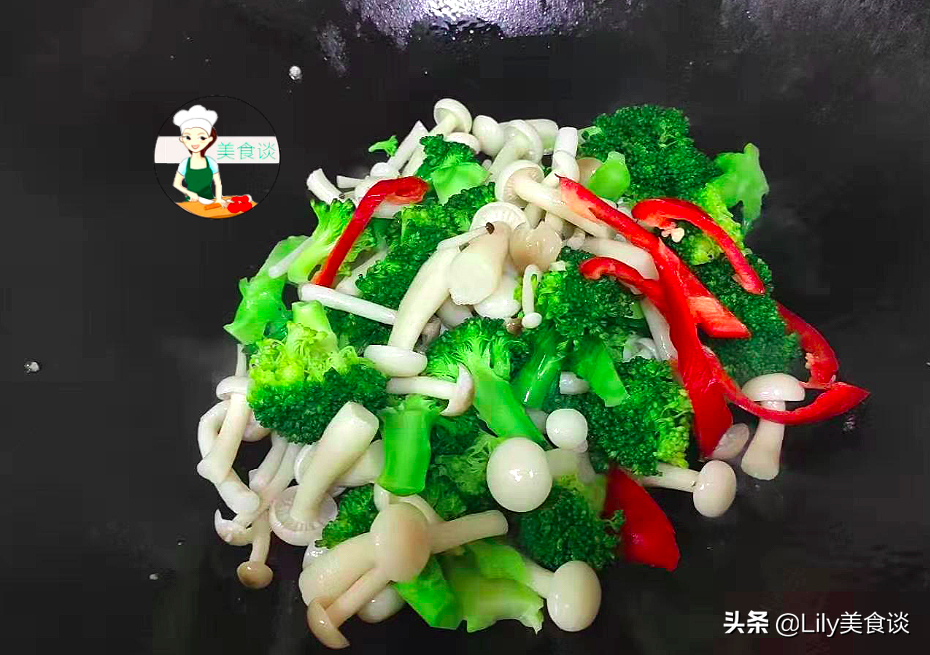 7、加入焯水好的西蓝花和杂菇、少许青红椒丝下锅一同翻炒。