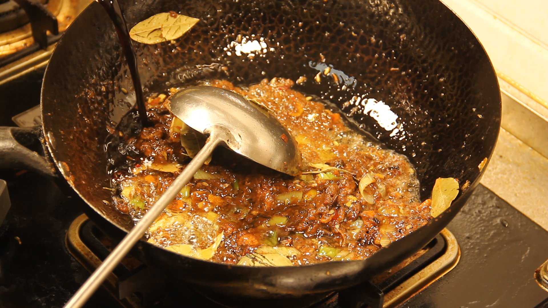 需要慢慢炒,不用着急,炒出酱香后,再倒入适量生抽,再加点蚝油,
