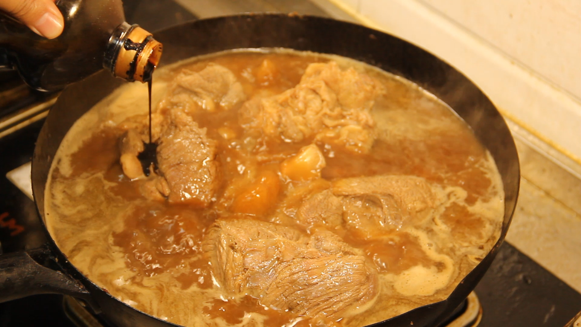 这时候可以放入牛肉,如果觉着颜色不够深,可以再补些老抽,