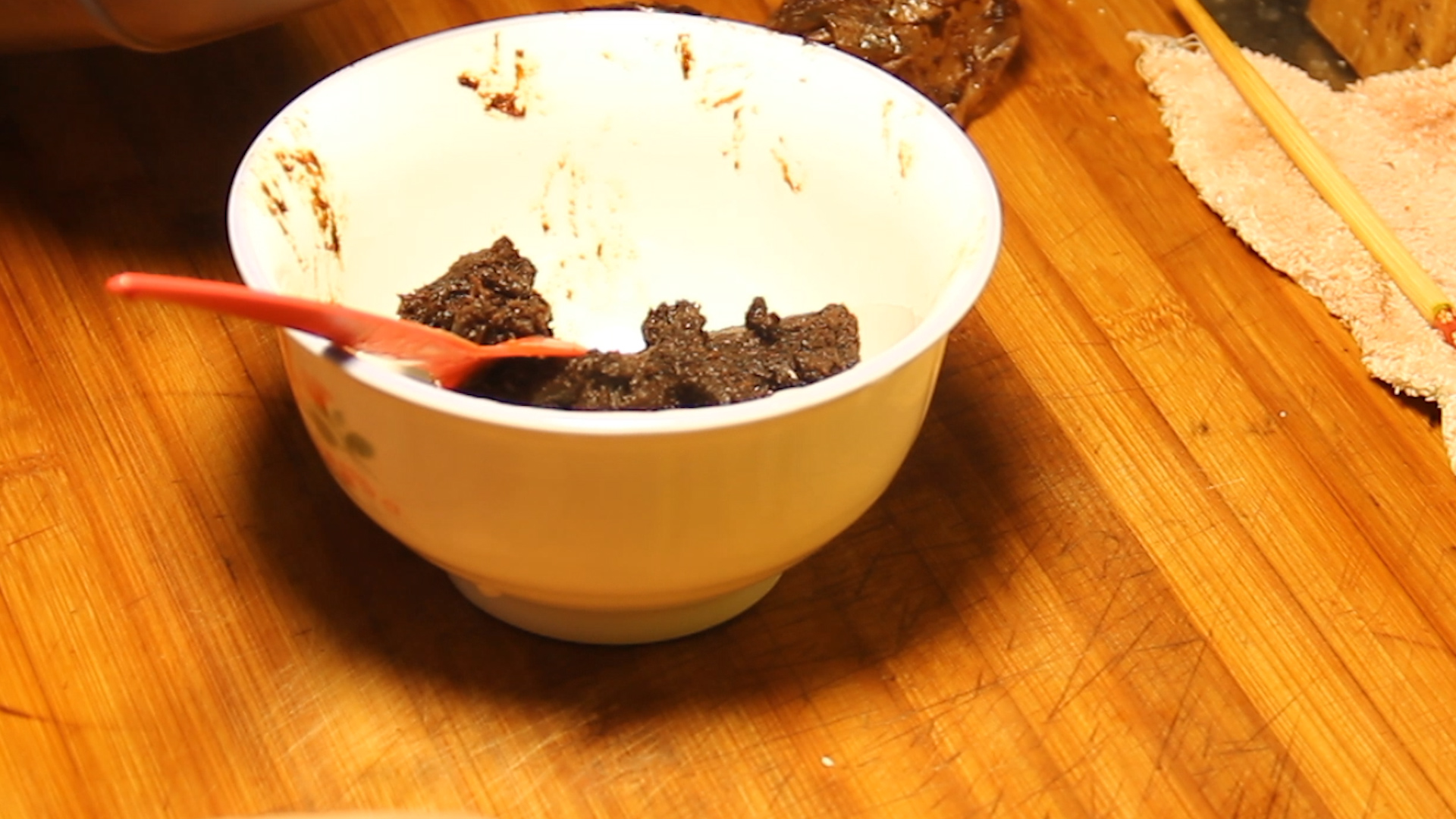 浸泡好,清洗完毕后,我们先取一袋干黄酱盛到碗中,