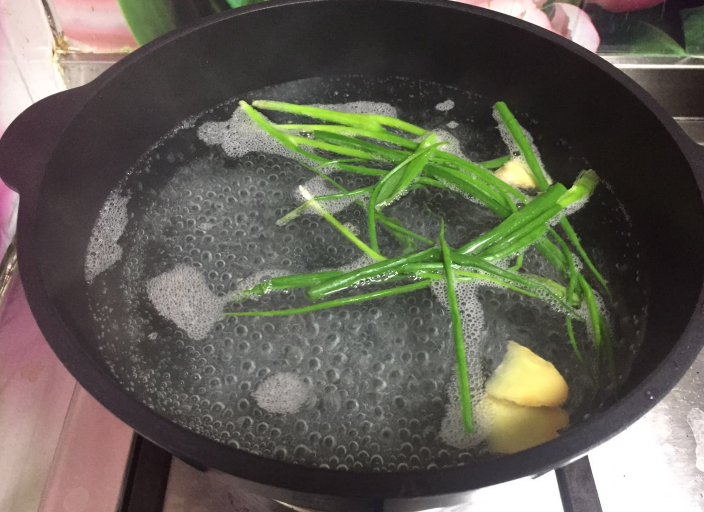 准备几个葱结、姜片,锅里倒入适量清水,加入葱、姜、食盐、料酒、食用油。