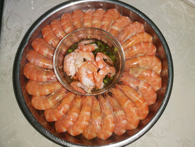 将大虾捞出沥水,摆在盘子外圈,中间放在料汁碗,一盘好看又好吃的水煮虾就做好了。