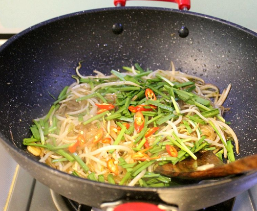 第六步、转大火,倒入豆芽,加入适量盐、蚝油,快速翻炒半分钟,让粉条和豆芽充分入味,再淋入少量的清水,盖上锅盖焖半分钟,即可关火出锅。