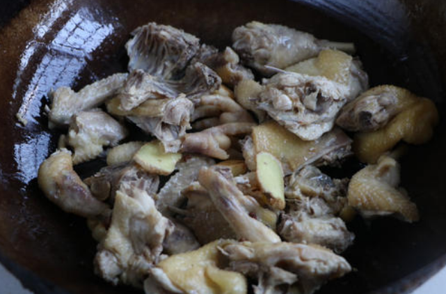 锅里倒入适量油,五成热时倒入鸡块,小火煸炒出鸡皮下的油脂,再加入葱段、姜片炒出香味,鸡汤保证非常香。