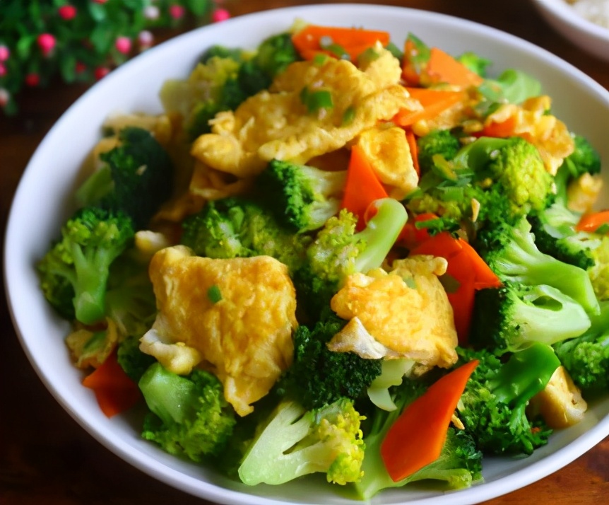 第四步:把泡发的木耳用清水清洗干净,再切成小朵的,接这种在锅中加入油,把切好的葱段、姜片和蒜片倒进锅中,炒出香味以后倒入胡萝卜,胡萝卜炒至断生后倒入切好的红椒和木耳,翻炒均匀后再倒入西蓝花,快速翻炒,最后加入适量的盐、蚝油、生抽和鸡精,翻炒均匀之后倒入鸡蛋碎,最后加一点香油,翻炒均匀即可出锅。