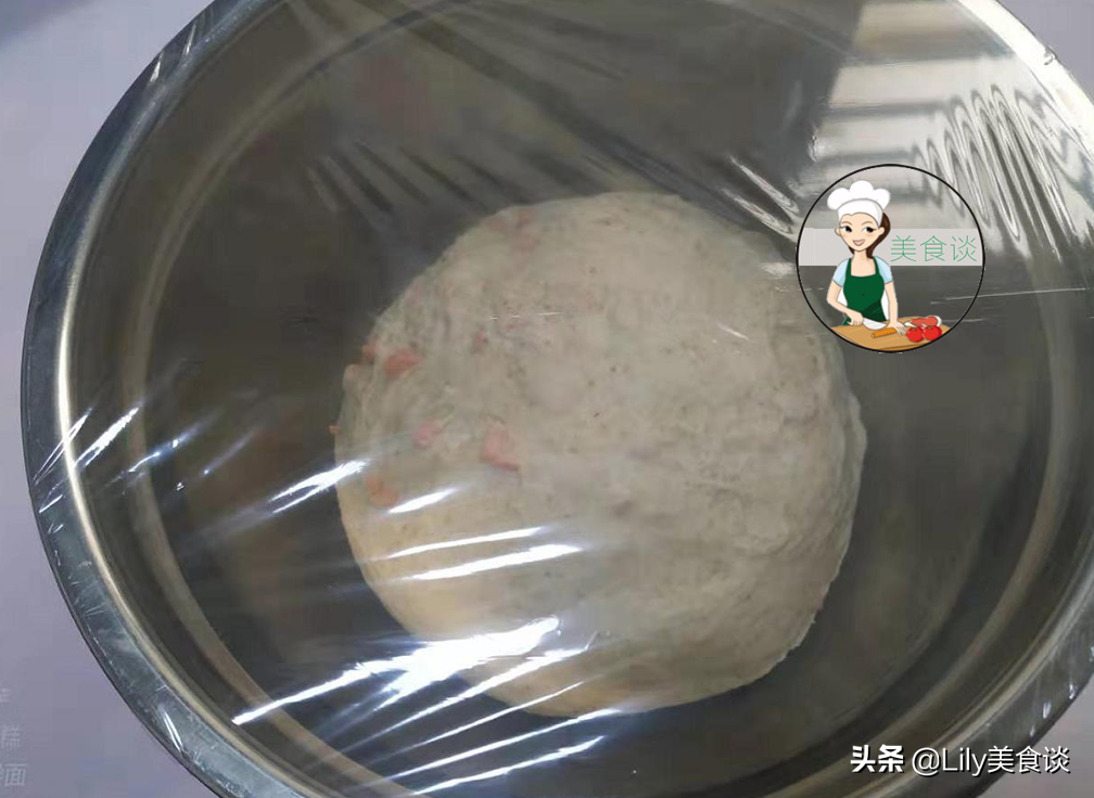 2、这里是加入了小火腿丁一起揉的面团,大家也可以根据自己的口味喜欢添加配料,可以加入蜜红豆、葡萄干、坚果干等等,都各有风味。
