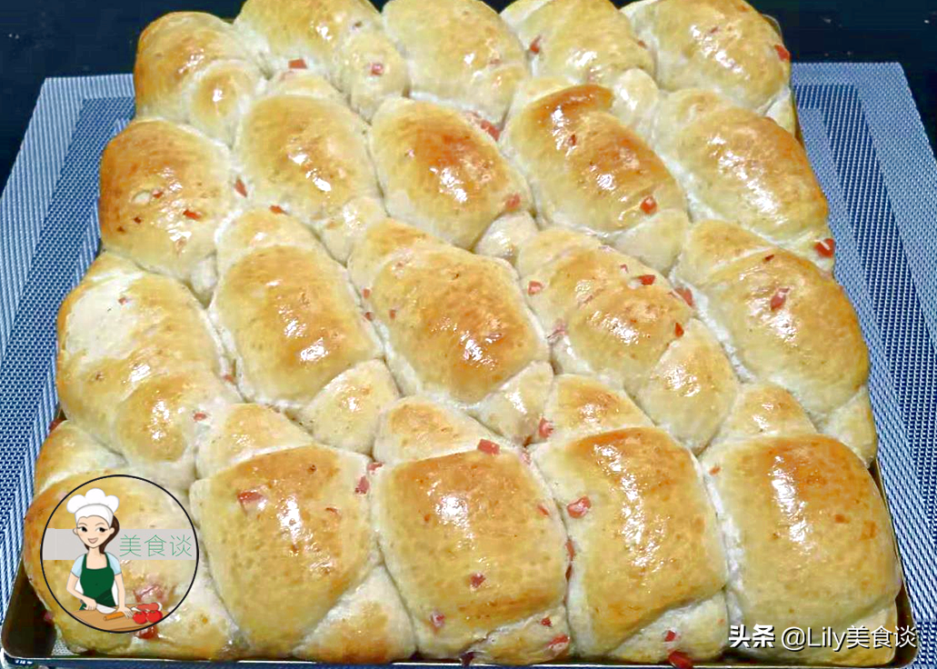 出炉后放凉面包变软即可上桌享用,这样一道家常版的:火腿小面包就做好啦,这样做出来的烤面包柔软拉丝,还带有火腿粒的鲜香,非常营养又好吃,当早餐包或者是下午茶点心、小朋友的零食面包吃都是非常不错的,一次可以烤多一些,吃不完的用保鲜袋密封保存起来,可以吃3天不坏呢,小朋友开学了,早餐吃2块面包搭配牛奶,一顿快手的营养早餐就搞定啦。简单营养美味的做法分享给你,喜欢可以试试哦。
