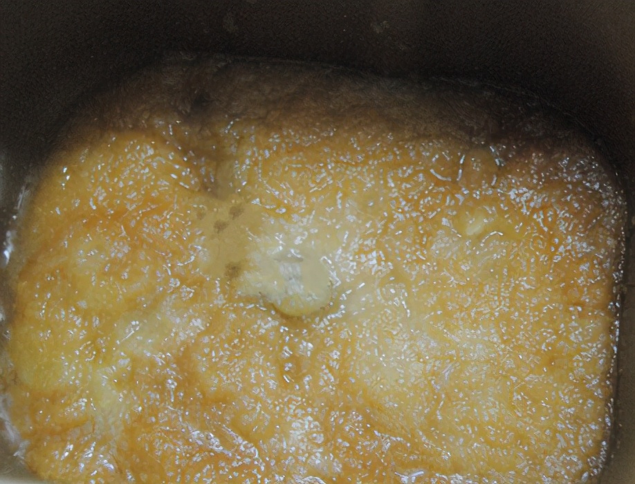 第四步,慢慢地便会看到其中的糖水越来越少,熬煮一个小时的时间,苹果丁变得如同酱一般粘稠,继续熬煮10分钟,苹果酱就做好了;