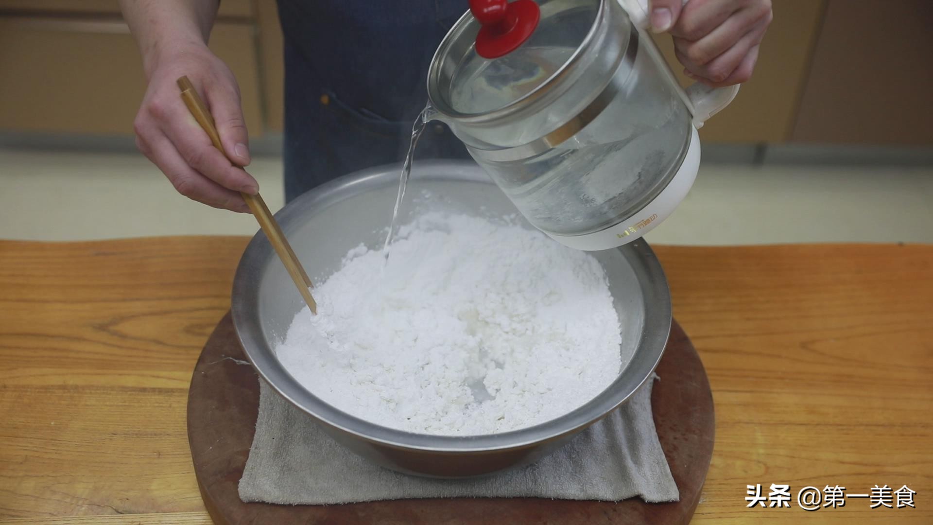 我们先做汤圆皮,盆中放入适量的糯米粉, 用开水烫面,汤圆想要不开裂,还圆润, 必须用开水烫面。