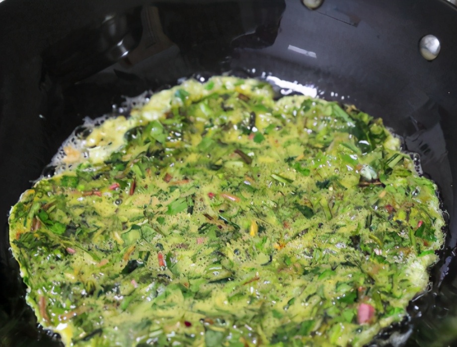 第四步,蒲公英鸡蛋液淋入在锅中,先别急着翻炒,待将鸡蛋液的底部煎至定型的时候,翻个面,用铲子将蒲公英鸡蛋铲成小块,同时蒜末放入锅边;