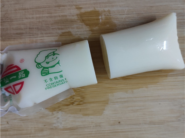 1.首先将日本豆腐带包装对半切开,然后慢慢挤出来,这样豆腐在挤的过程中不容易烂,又好看又美观。