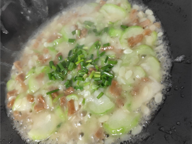 2.葱花切好备用,水瓜去皮洗净,再准备萝卜干(菜脯)一个,葱花不喜欢可以不放。