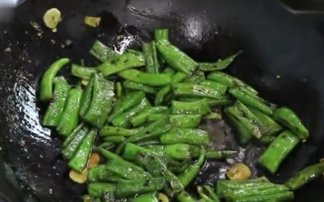 4.锅内加入少许油,下入姜片和豆鼓,炒香之后下入刚刚煸好的青椒,翻炒均匀。