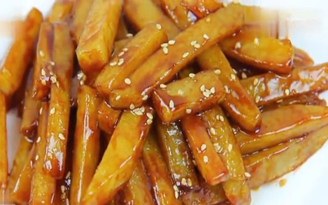 12.最后撒上一些熟芝麻作为点缀,这道简单好吃的酱汁土豆条就做好了。