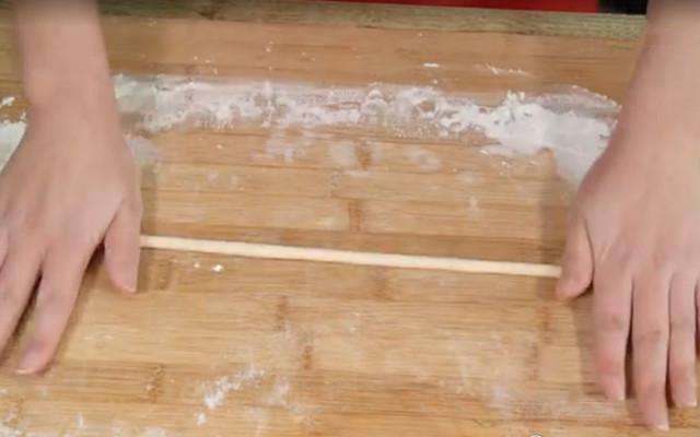 9.取一小条面用手搓成长条。