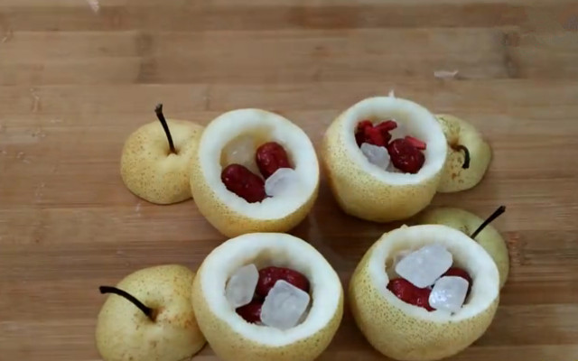 6.每个雪梨中放入适量的银耳,再放入红枣、冰糖和枸杞。