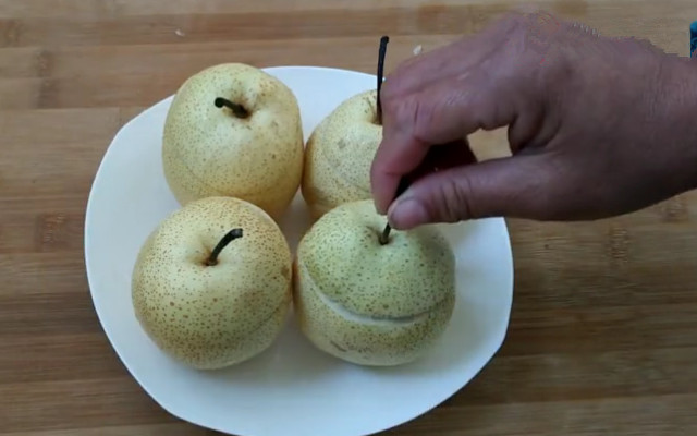 4.把雪梨清洗干净,在雪梨的三分之一处切开。