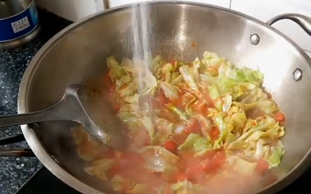 卷心菜、西红柿、油、花椒、生抽、白糖、食盐、素蚝油