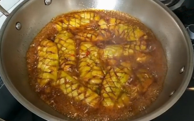 4.锅内加适量的食用油,油温大约5成热的时候茄子下锅炸,炸至金黄捞出备用。