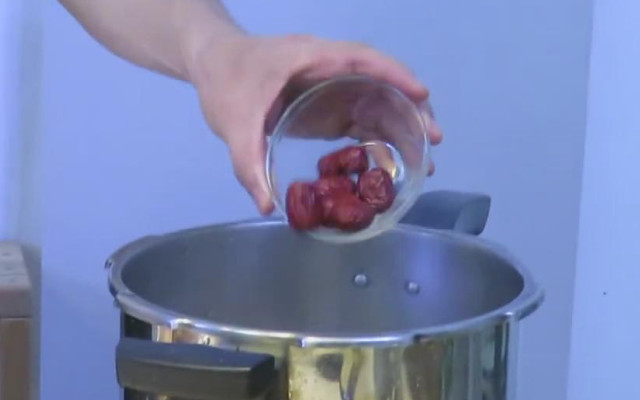 7.再放入几颗红枣,洗干净以后放入锅里。