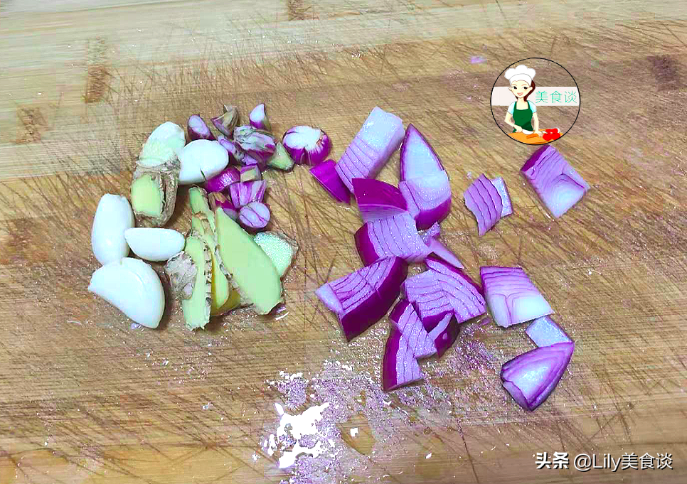 准备食材:牛腩一斤、番茄3个、土豆2个、洋葱半个、番茄红烩调料一块、蒜头适量、姜片适量、红葱头少许。